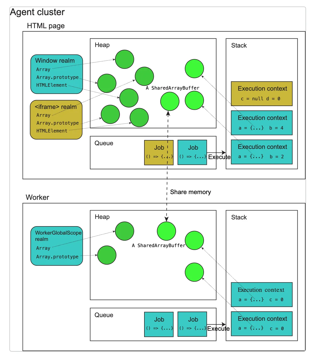 아래 그림을 보면, HTML Page와 Worker는 서로 고유한 에이전트를 가지며 자체적인 메모리 힙과 스택, 작업 큐(이벤트 루프)를 운영하는 것을 볼 수 있다. 그리고 HTML Page 에이전트는 메인 Window와 내부의 iframe 각각의 영역을 소유하고 있으며, 이 영역들은 에이전트의 메모리 힙을 공유하는 것을 볼 수 있다.