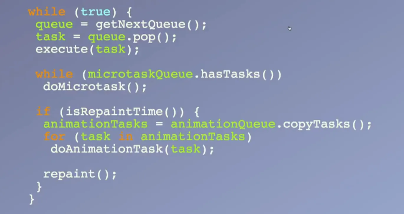 브라우저 이벤트 루프도, Node.js와 마찬가지로 정해진 순환 구조를 반복하는 건 마찬가지다. 아래 그림은 브라우저 이벤트 루프의 동작 과정을 수도코드로 나타낸 것이다.