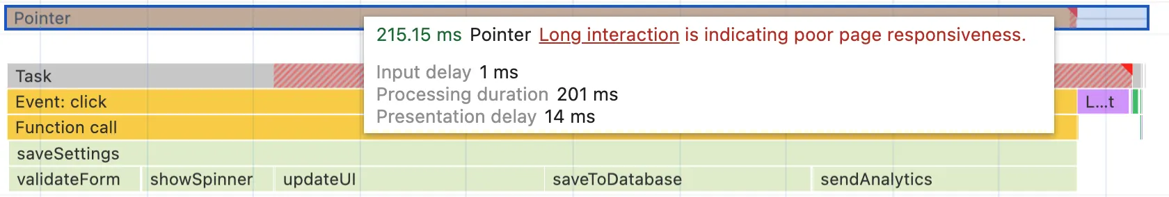 이상적으로는 60Hz 주사율 디스플레이 기준으로, 메인 스레드에서 3가지 큐(macroTaskQueue, microTaskQueue, animationTaskQueue)의 작업들을 완료하고 렌더링 파이프라인을 16.6ms 내에 수행해내야, 컴포지터가 제 시간에 frame drop 없이 화면을 표시할 수 있다. 하지만, 긴 작업(Long task)은 자바스크립트의 Run-to-completion 모델에 따라 브라우저의 메인 스레드를 차단하여, 상호작용을 시도했을 때 사용자 인터페이스가 응답하지 않는 것처럼 느껴지게 만들 수 있다.